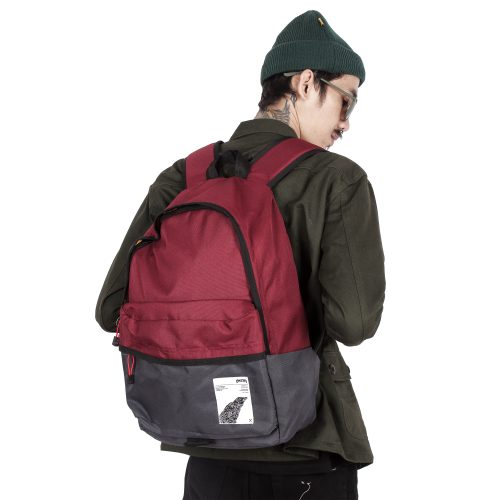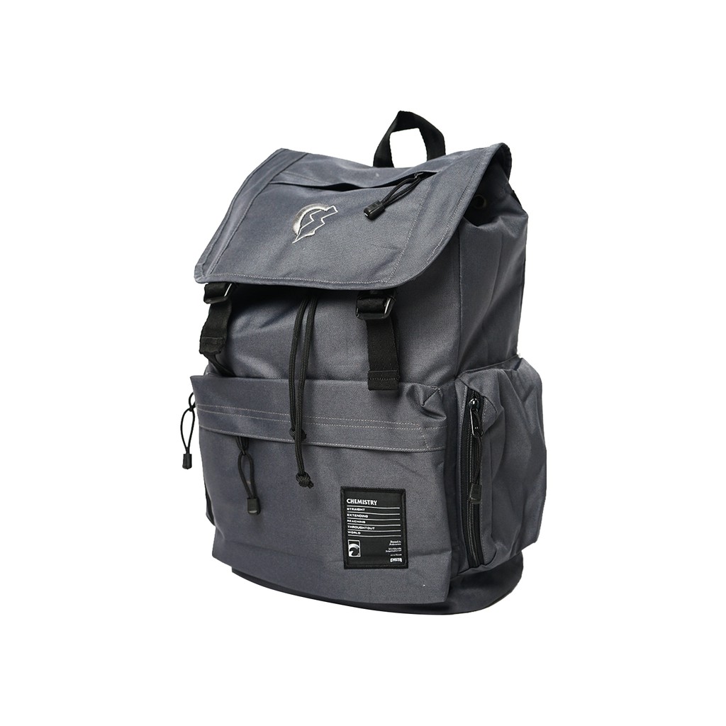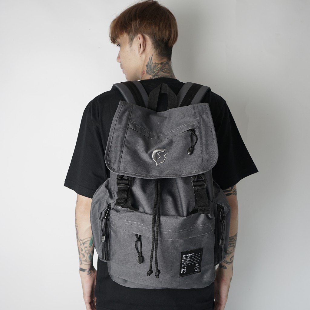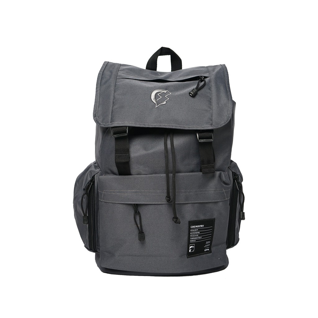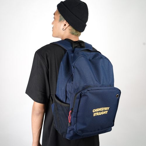 Simple and sturdy chemistry straight backpack with cs logo embroidered design and patch box on the front.