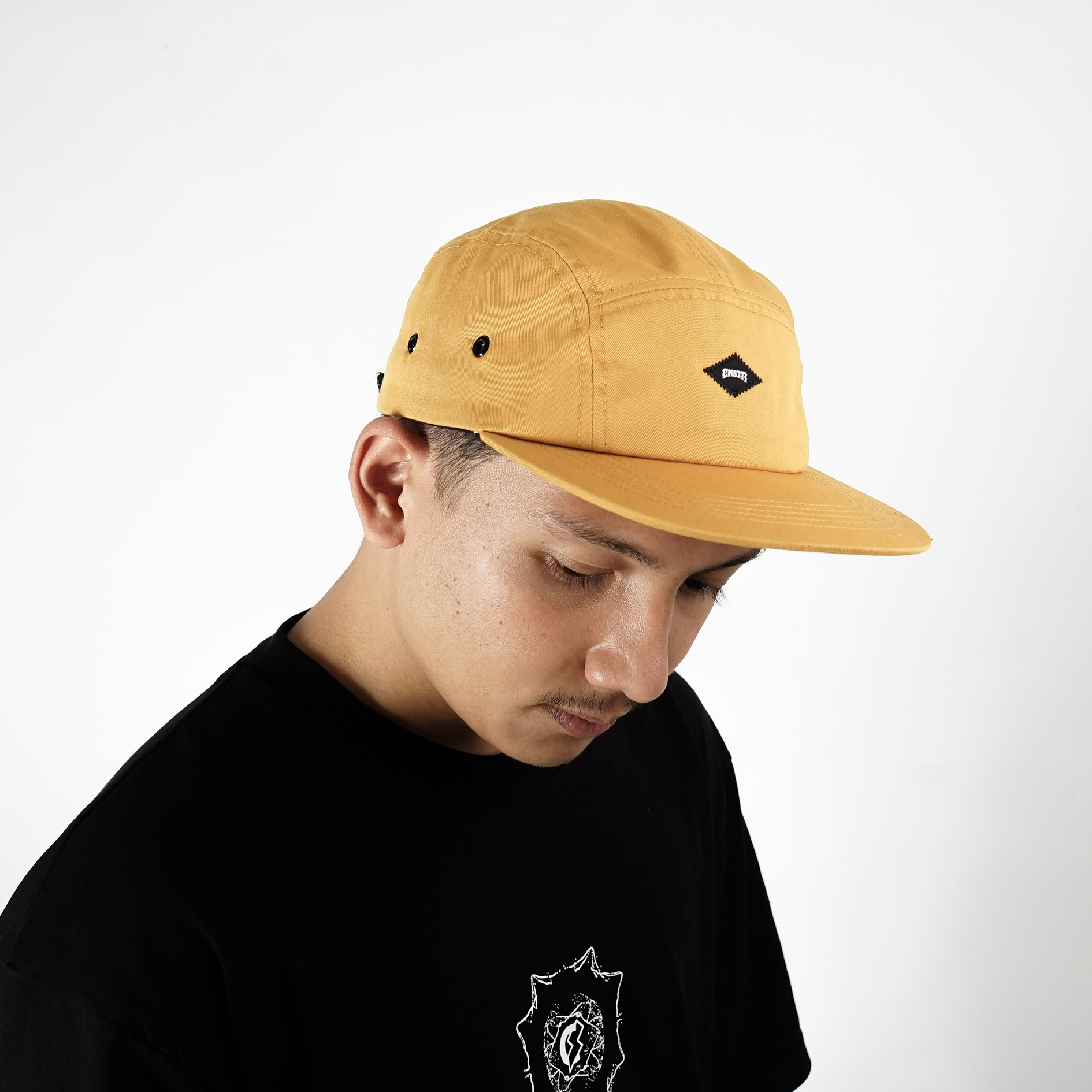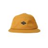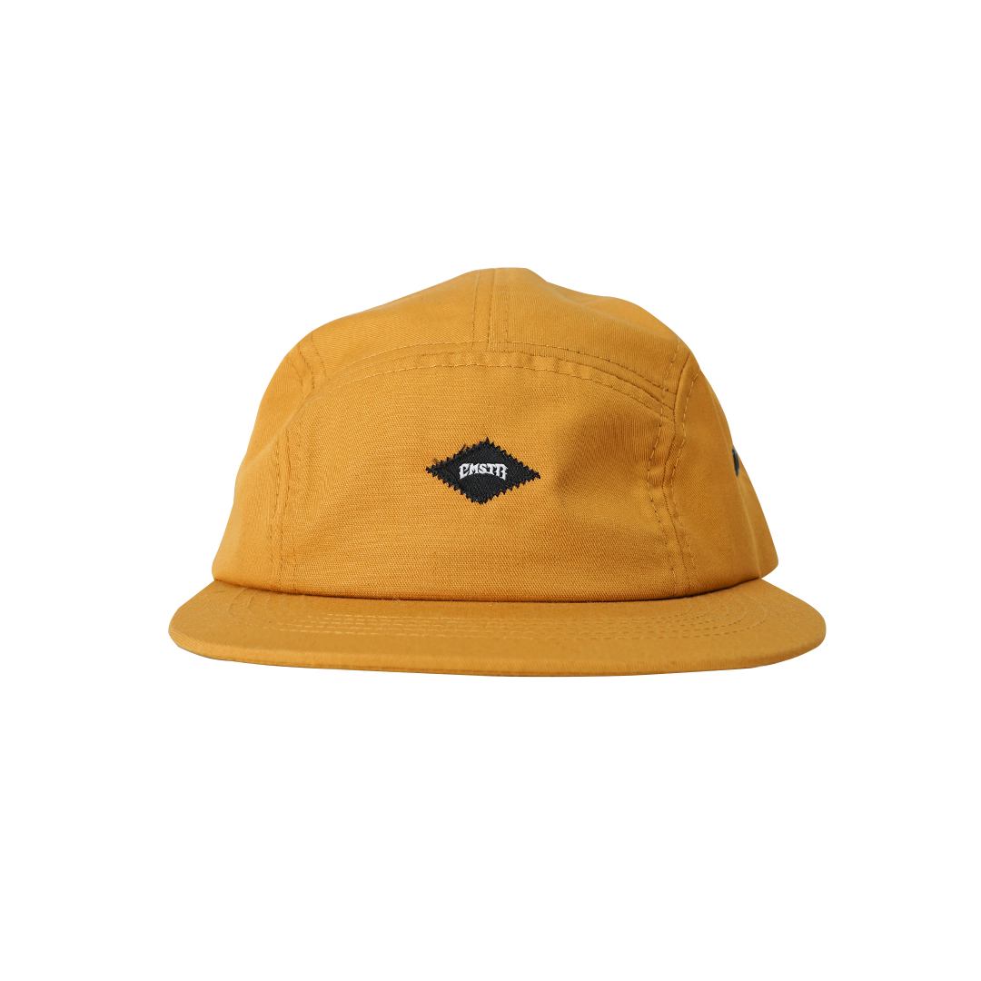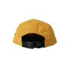 Yellow cotton 5 panels strap back caps with woven patch at front.