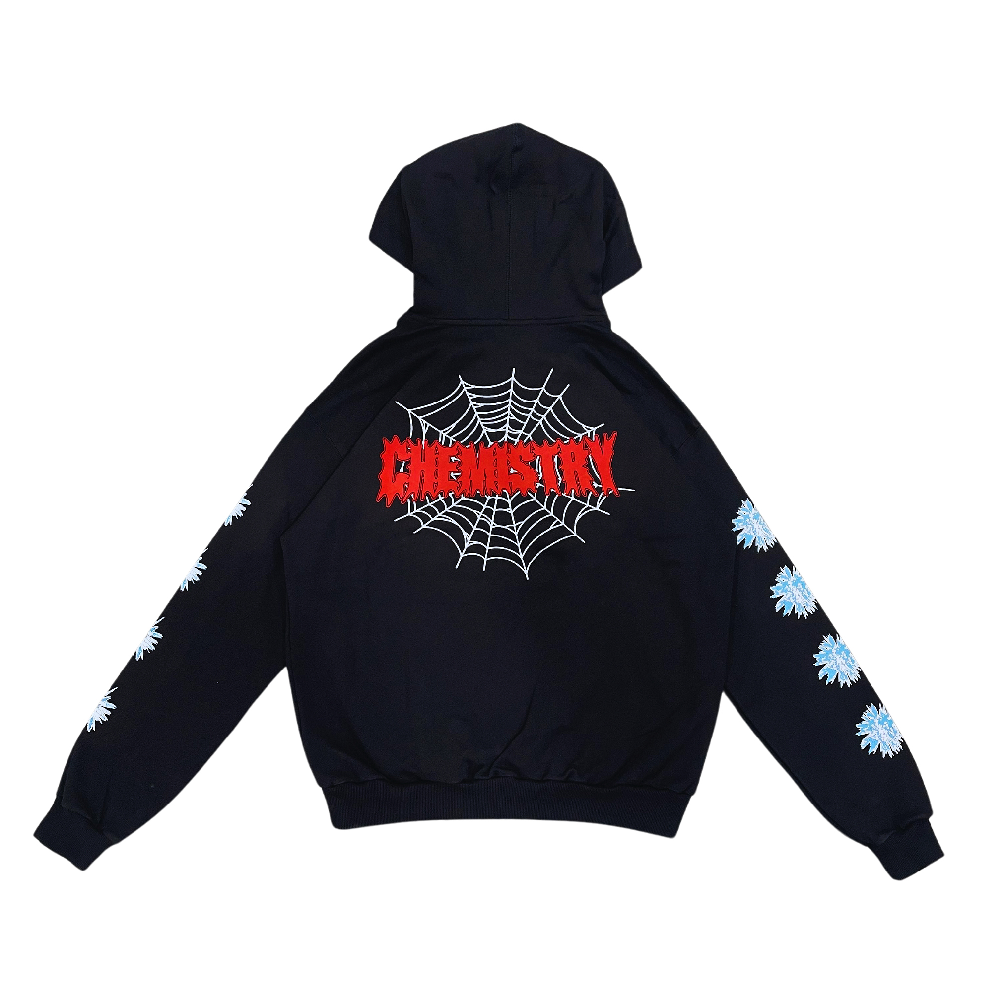 Boxy Fit Hoodie with a spider design on the front and back with a floral design on the sleeves